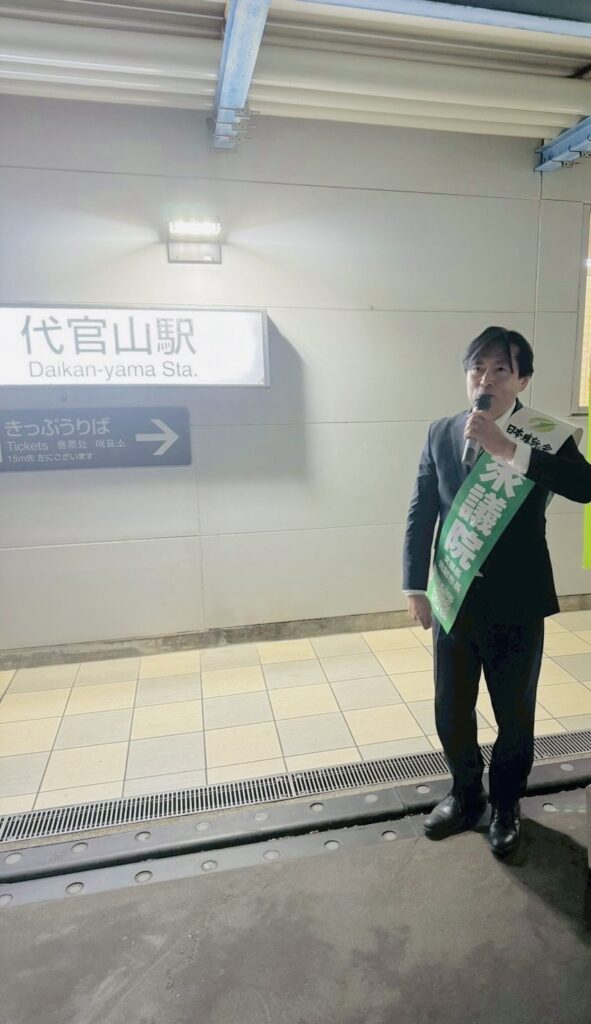 本日は、慶應義塾大学に通っていた頃からよく通った、思い出深い代官山駅前でご挨拶させていただきました。