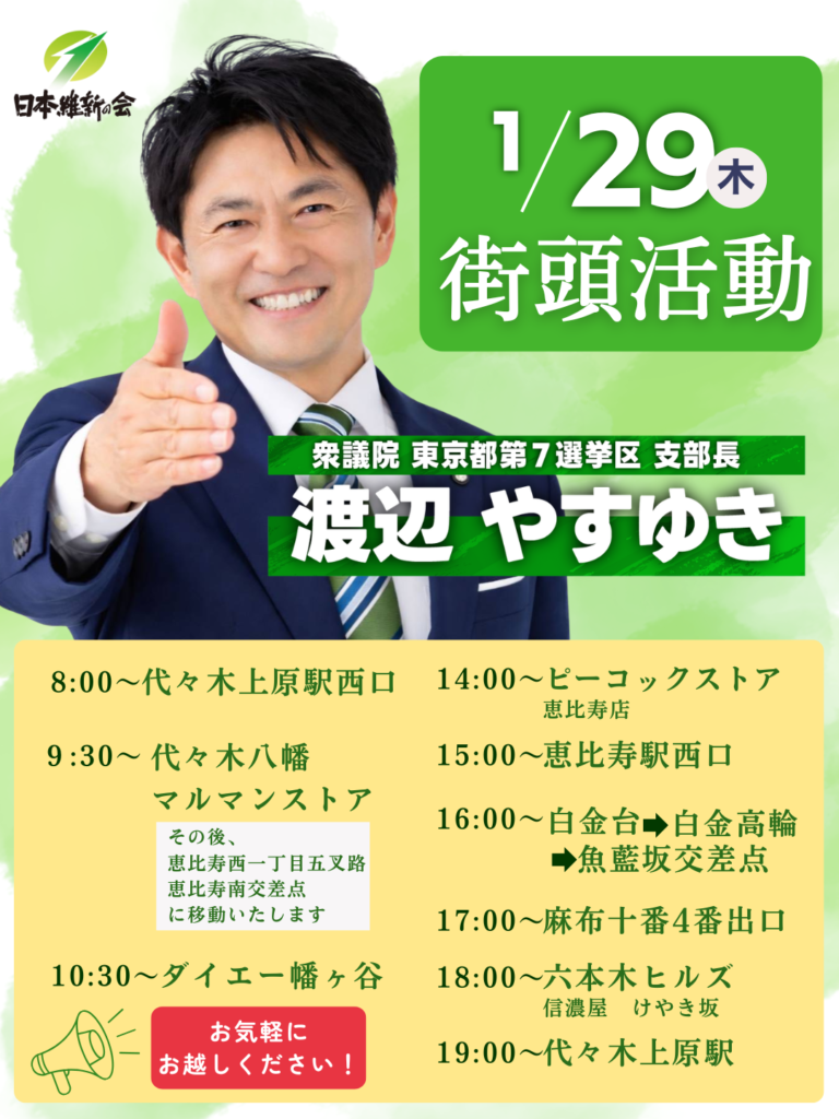 【本日1/29(木)予定】港区・渋谷区を全力で!現場の声が日本を変える力になります。
