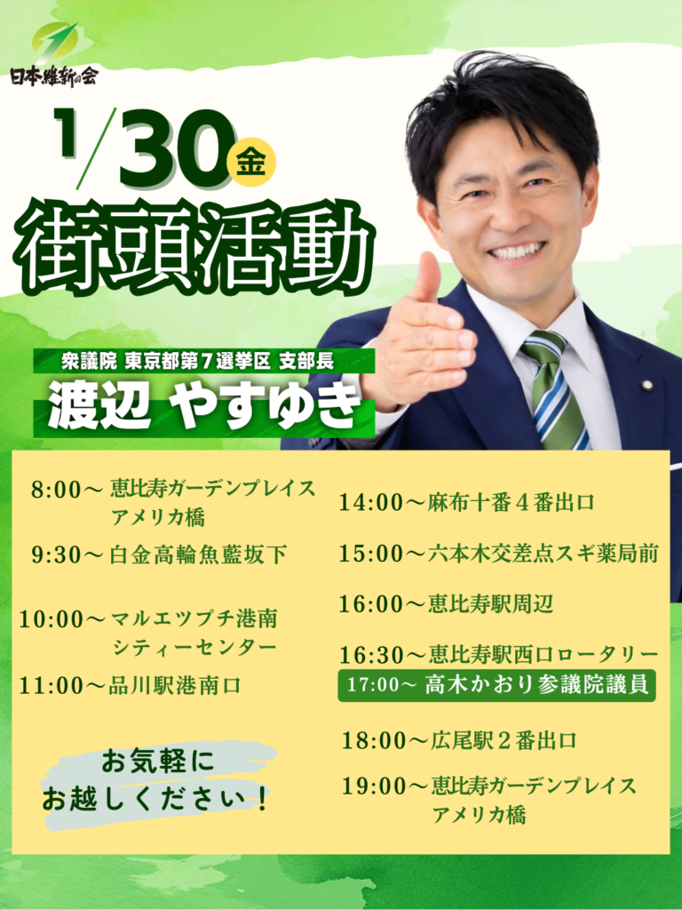 【街宣スケジュール】1月30日(金)の街頭活動予定