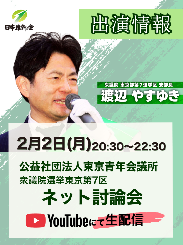 本日夜、公益社団法人東京青年会議所(JC)主催の討論会に出演いたします。