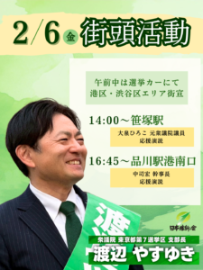 本日2月6日は、午前中に選挙カーで港区・渋谷区エリアを隅々まで巡り、午後からは笹塚駅を中心に街頭活動を展開いたしました。